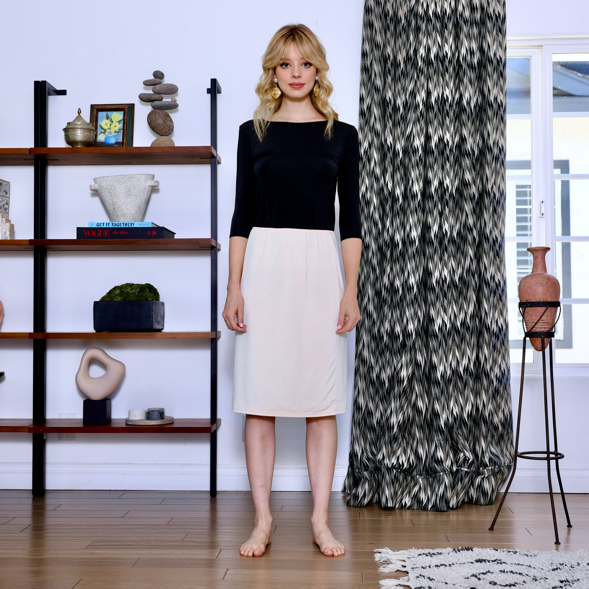 • This slip skirt is perfect under all clothing.  It can also act as lining under sheer styles. The slip should be fitted/snug on the body when worn with as a layering piece. Fabric has stretch. If you are in between sizes on the chart and prefer some extra wiggle room, size up. Otherwise, stick to your true size.