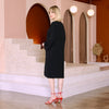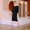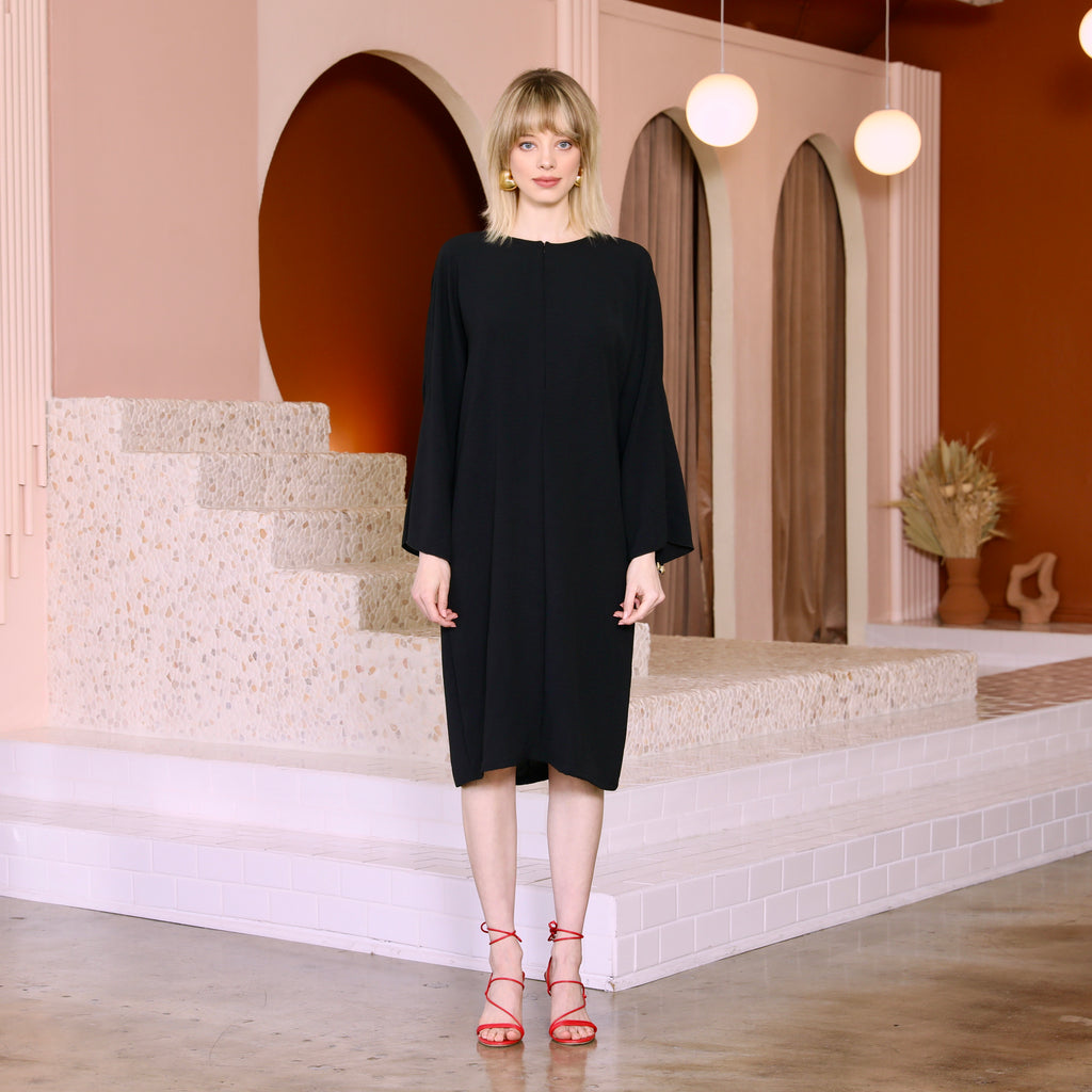 This dress has a slightly loose, yet straight cut and can accommodate multiple sizes because of its bodice and adjustable drop sleeves. Sizing is based on the width of dress at chest/hips and the length of the sleeves and dress (which get longer as you size up). A belt can be added (sold separately) if you want to add some structure to this style. If you are between sizes on the chart, you can size down if you want it shorter/less boxy in the body. Keep in mind that this fabric is more airy and fluid, so although the shape is a bit wider than our other styles, it will still drape beautifully.  Stay with your true size for maternity if you are in the earlier months, or size up if you are in the end of the final trimester. Based on customer try-ons, petites opted to size down because of length. Most stuck to their true size on the chart for the intended slightly relaxed fit.