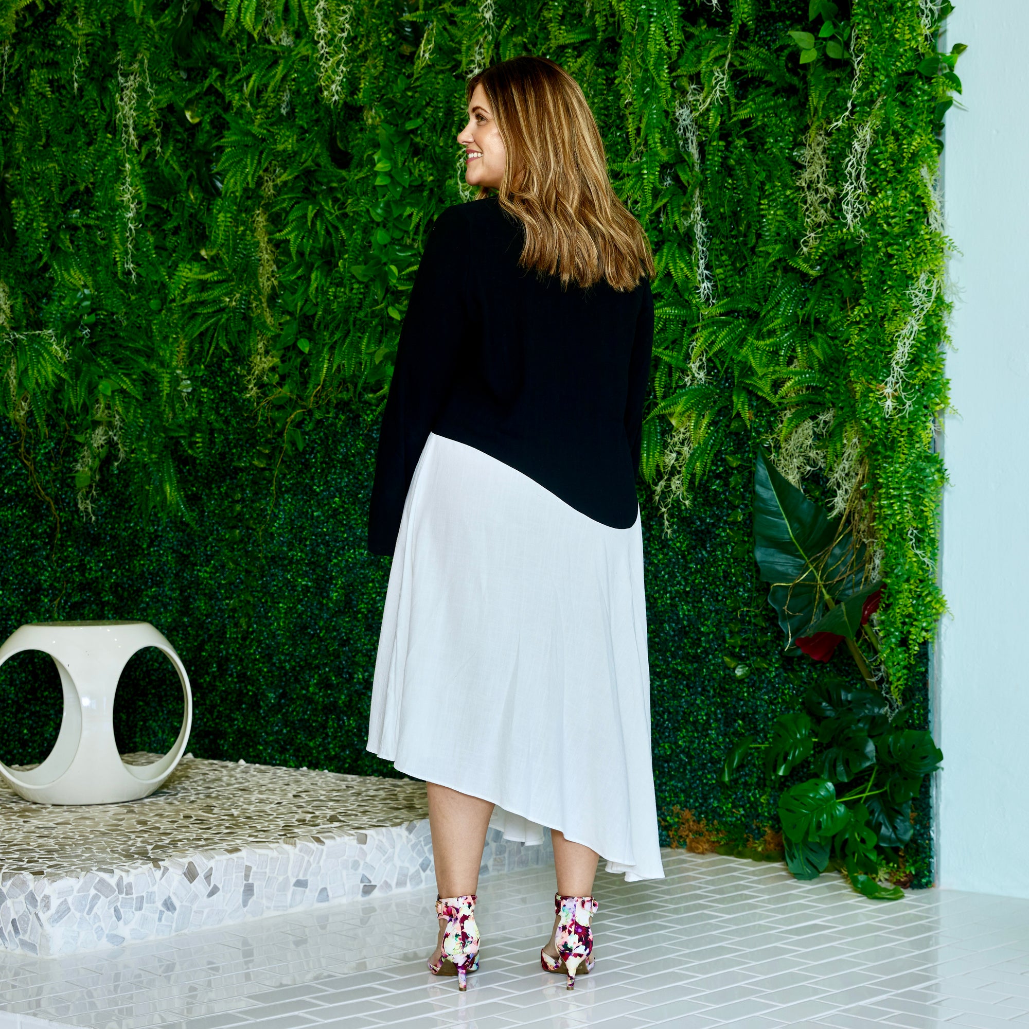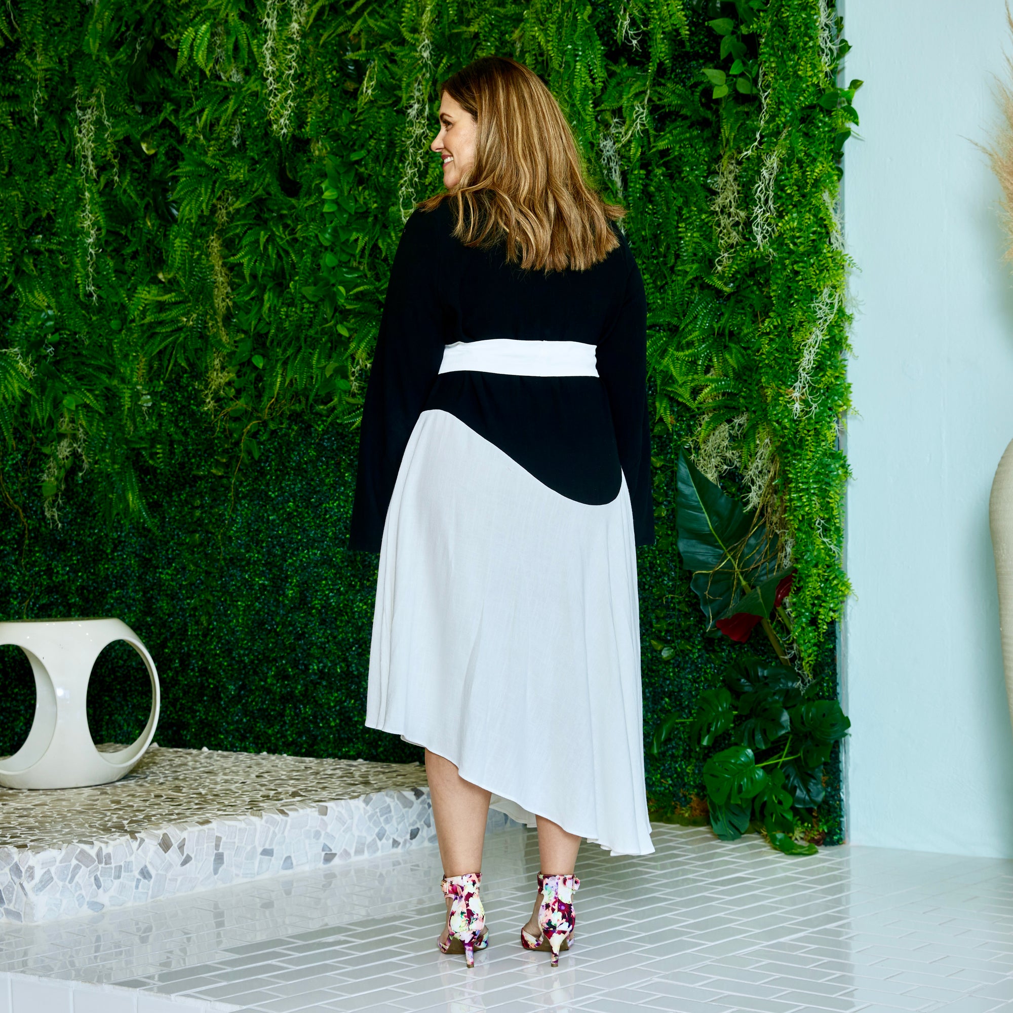A style that's ahead of the curve, the #linearSWIRL is the newest frock on the block. Plus, you can turn the round neck into a 'V' cool new style with the front facing zipper!
